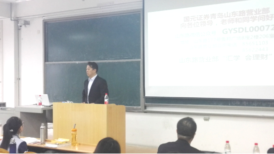 整场讲座演讲嘉宾密切联系行业和市场实践,幽默风趣、引人入胜,师生反响热烈。囯元证券山东路营业部区域经理刘云、团队长梁益波、张斌,金融系部分教师和2014级金融学专业同学参加了讲座。