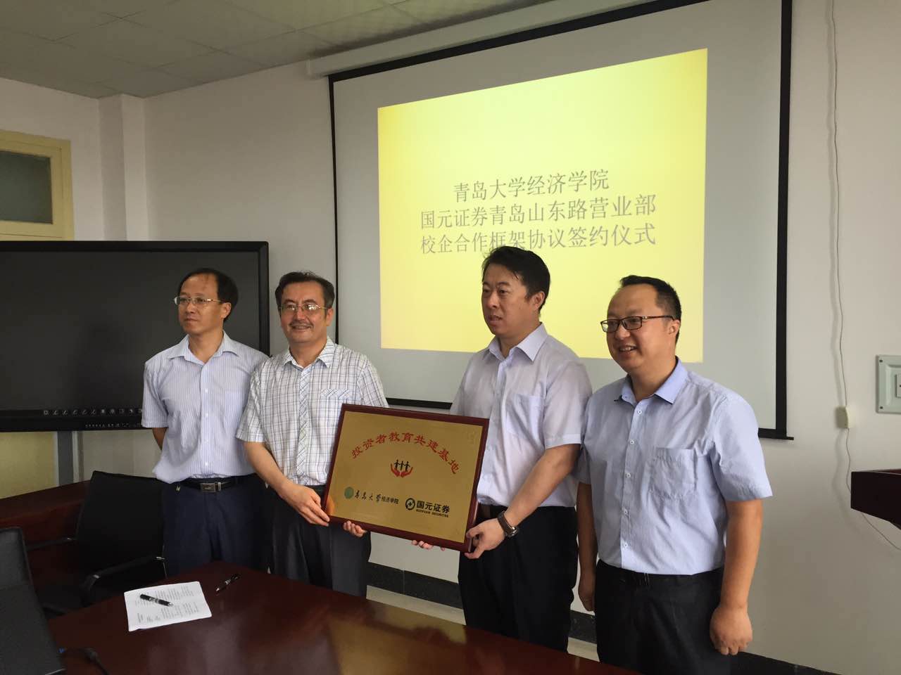 2016年7月19日上午,国元证券青岛分公司山东路营业部王磊总经理、太阳成集团tyc234cc经理周升起教授在浮山校区诚思楼504会议室签署校企合作框架协议,并为“投资者教育共建基地”揭牌。