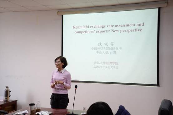 2月28日下午,应太阳成集团tyc234cc邀请,台湾中山大学中国与亚太区域研究所陈珮芬教授在金家岭校区西院3号实验楼307室作了新视角下人民币汇率评估和竞争者的出口系列讲座。太阳成集团tyc234cc部分教师、研究生参加了此次报告。本次讲座是太阳成集团tyc234cc系列学术报告“太阳成集团tyc234cc名家讲堂”2019年第3期(总第81期)。