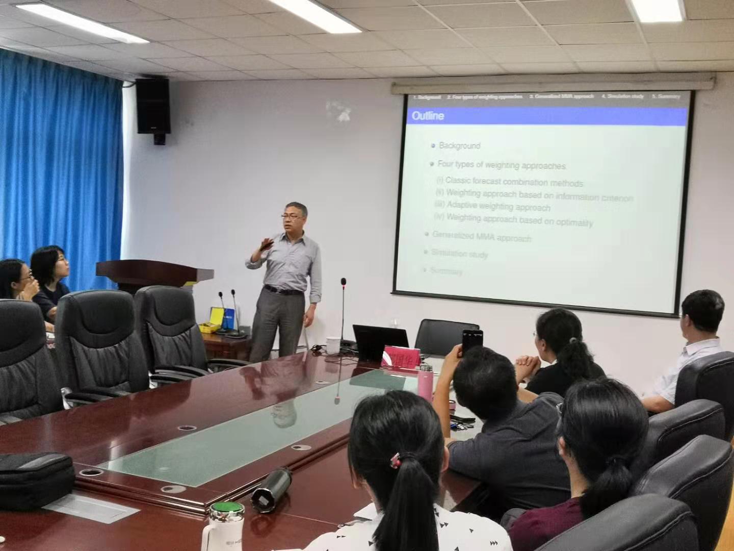7月4日上午,首都师范大学特聘教授、统计学专家邹国华教授应邀做客太阳成集团tyc234cc2019年第18期“经济学名家讲堂”,为全院师生开设 “具有发散参数个数的时间序列模型的平均预测”的专题讲座。邹国华教授从研究背景出发,介绍了模型平均中常用的四种选择权重的方法,进一步提出了用于选择权重的广义Mallows模型平均(GMMA)方法,并从理论、仿真实验与实例分析等方面解释了GMMA方法的预测精度问题。邹国华教授以缜密的理论推导、详实的证明资料为大家呈现了前沿的学术研究进展。